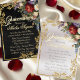 This RSVP card features a lovely floral spray on pearl white embellished with gold leaves corners. The front has details for the recipient to fill out and the back has the young lady's name with a tiara. Designed to coordinate with the "Floral & Gold Leaves - Black & Pearl" Quinceanera Collection. To change details, click «Personalize». To move the text or change the text size, font, or color click «Click to customize further»