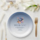 Dieser Abschluss Papier Platte Design verfügt über einen Blumenhut auf einem blau-weiß-farbenen Hintergrund mit anpassbarer Typografie. Das ist die perfekte Karte, um Ihren Gästen bei der Feier Ihres Abschlusses zu dienen.
