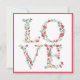 Die Karte des süßen Valentins enthält dekorative Blumenbriefe, die die LIEBE ausdrücken. Jeder Buchstabe hat eine grüne Weinrebe mit leuchtend roten Blume. Einige Buchstaben enthalten einen Umschlag und eine rote Krone. Sowohl vorne als auch hinten ist eine koordinierende rote Grenze. Die Farben sind grün, rot und weiß. Der Rücken ist leer verlassen, damit Sie Ihre eigene Nachricht schreiben können.