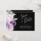 Diese elegante, moderne rett-the-date-Karte verfügt über ein Blumenstrauß in lila und Lavendeltönen, bestickt mit Silberfolie aus Imitat und Imitaten Glitzer Blattwerk und mit silbernen Imitaten Glitzer bespritzen. Der anpassbare Text kombiniert beige silbergraue Handschrift, Copperplate und kursiv Schriftart auf schwarzem Hintergrund. Die Rückseite weist ein passendes Blumendesign auf.