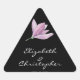 Personalisierte Dreieck-Aufkleber mit einer schönen lila magnolienblüten Wasserfarbe und Ihr Text in schicken weißen Schriftzeichen auf schwarzem Hintergrund, perfekt für Hochzeitsfeier Gefallen, Brautparty, Hochzeitseinladung Siegel und mehr. In verschiedenen Formen erhältlich. PAKETE IN unserem Geschäft.