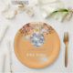 Set der Szene für eine Disco-Themenfeier. Orange ist die Hintergrundfarbe für diesen blühenden Disco-Ball elegantes Brautparty-Design. Ebenfalls auf dem Design befinden sich silberne Farbflecken. Ändern Sie einfach die Informationen für Ihre eigenen Party-Teller. Brautparty Hochzeitsdesign.