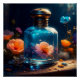 März 21 ist der Tag des Duftes. Stillleben einer Parfümflasche mit Pfirsich und blauen Blumen.