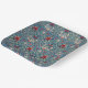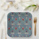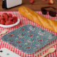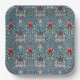 Intricate floral pattern with red, cream, and green leaves on a blue background. Symmetrical design evokes a classic, elegant, and ornate feel.