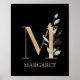 Letter M monogramm floral. Letter M in goldbrauner Textur mit grünen Aquarellfarben Blätter, Blume Blüten und Goldstaub. Personalisieren Sie mit Namen im passenden Schriftart.
