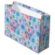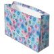 Diese große Geschenktasche aus Papier wird in einem hübschen blauen und rosafarbenen Blumendruck gezeigt. Passen Sie diese Geschenktasche an oder kaufen Sie, wie es ist. Lizenzierte Printwerbung