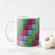 Handcrafted floral quilt design featuring vibrant patchwork blossoms in blue, pink, and green