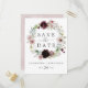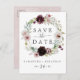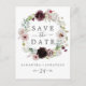 Diese blumengeschmückte Romantik Ankündigung Datum freihalten Postkarte eignet sich perfekt für eine elegante Hochzeit. Das moderne rustikale bohobische Design besticht durch romantische Aquarellfarben in sanften Farbtönen wie Bordeaux, Lila, Rosa und Cremeweiß mit grünen Blätter.