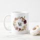 Customizable mug featuring a burgundy, pink and white floral watercolor wreath with green foliage accents. This elegant wreath frames a classic black monogram. Easy to personalize and makes a great gift.
