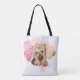Diese Tasche ist mit einem zauberhaften Bräuner und Grauen Yorkie Dog mit großen braunen Augen versehen. Das Bild wird auf einem abstrakten rosa und blassfarbenen Aquarell mit einem subtilen rosa Rosenbild auf einer Seite platziert. Ein Strauß mit rosa und goldenen Blume befindet sich ebenfalls ganz unten rechts. Grauer Text über und unter dem Bild sagt: "ZUHAUSE ist dort, wo mein YORKIE ist." Die Rückseite der Tasche hat den Hund und Blumenbild ohne den Text.