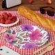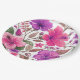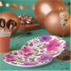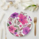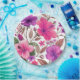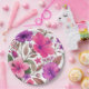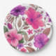 Das Bild zeigt ein lebendiges Mosaik aus üppigen Hibiskusblüten in kräftigem Pink, zartem Lila und tiefem Purpur, die sich harmonisch über einen weißen Hintergrund erstrecken. Die Blüten sind mit filigranen Blättern und zarten grünen Stielen verbunden, die eine natürliche Eleganz ausstrahlen. Es vermittelt ein Gefühl von Freude, Wärme und exotischer Schönheit, als würde man in einen tropischen Garten eintauchen, der von Farben und Leben durchdrungen ist.