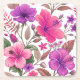 Das Bild zeigt ein lebendiges Mosaik aus üppigen Hibiskusblüten in kräftigem Pink, zartem Lila und tiefem Purpur, die sich harmonisch über einen weißen Hintergrund erstrecken. Die Blüten sind mit filigranen Blättern und zarten grünen Stielen verbunden, die eine natürliche Eleganz ausstrahlen. Es vermittelt ein Gefühl von Freude, Wärme und exotischer Schönheit, als würde man in einen tropischen Garten eintauchen, der von Farben und Leben durchdrungen ist.