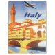Vintages Beispiel für ein europäisches Reiseplakat aus Florenz, Florenz, Italien mit dem Uhrturm des Palazzo Vecchio (Rathaus) und einem Flugzeug, das im Himmel fliegt. Ein Mann rudert ein Boot unter der Ponte Vecchio (auch "Alte Brücke" auf Italienisch genannt). Die wunderschöne Architektur der städtischen Gebäude ist im Hintergrund.