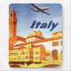 Vintages Beispiel für ein europäisches Reiseplakat aus Florenz, Florenz, Italien mit dem Uhrturm des Palazzo Vecchio (Rathaus) und einem Flugzeug, das im Himmel fliegt. Ein Mann rudert ein Boot unter der Ponte Vecchio (auch "Alte Brücke" auf Italienisch genannt). Die wunderschöne Architektur der städtischen Gebäude ist im Hintergrund.