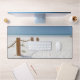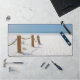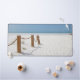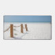 featuring the beautiful white sand beach and turquoise water of Sarasota, Florida with blue sky and nautical wooden pilings.