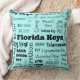 Ein reizend Kissen, das den Namen von Florida-Schlüsseln und einige seiner populären Standorte im schwarzen Text des unterschiedlichen Schriftartes und der Größen auf einem hellen Aquablauhintergrund kennzeichnet. Die Rückseite ist festes Schwarzes mit den Wörtern "Florida befestigt" im Weiß. Drehen Sie einfach das Kissen um, um den Blick Ihres Raumes schnell heraus zu ändern.