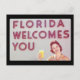 Florida aus den 1950er Jahren heißt Sie willkommen. Eine Frau, die ein Glas Orangensaft Vintag inspiriert Postkarte hält.
