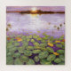 Puzzle des Florida Loxahatchee Nationalparks. Schöner Sonnenuntergang in den Everglades. Wasserlililien, farbenfrohe Blätter und Wasserspiegeln. Das Grün der lilly Pads ist auffallend, wenn sie im Fluss schwimmen und einen schönen Sonnenuntergang über den Everglades im Loxahatchee National Park in Florida haben. Die großen Gräser und Schilfröten strömen zwischen den Lilien hervor und man kann sehen, wie sie sich über den Fluss bis zur untergehenden Sonne zurückziehen. Der violette Himmel reflektiert im Wasser gegen die Grüntöne der Lilienpads und die untergehende Sonne dreht den Flussufer in der Ferne zu einem goldenen und orangefarbenen Strahl.
