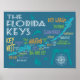 Die Florida Keys Map Original-Abbildung mit den Inselnamen im bunten Retro-illustrierten Kartenstil. Von Key West bis Key Largo und alles dazwischen hat diese Reihe von Inseln viel Spaß und interessante Namen. Eine Kontur der Geografie der Inseln ist umgeben von den Namen in tropischen Farben und künstlerische und lustige Typografie, und Illustrationen von einem Pelikan, Delphin, Segelfisch, Palmen, Segelboot, Stingray und Hummer, um einige der natürlichen Flora und Fauna der Keys.
