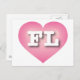 Diese Postkarte weist ein pulsierendes rosa Herz mit einem weiß gewaschenen Zentrum auf, das die fett weißen Großbuchstaben FL, die offizielle Abkürzung für Florida, den sonnigen Staat, enthält. Die Rückseite der Postkarte ist leer und wartet auf Ihre handgeschriebenen Stimmungen oder Ihren personalisierten Text.