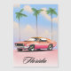 Florida Pink Sunset Reiseplakat mit einem retroamerikanischen Muskelauto gegen einen Sonnenuntergang im Abend.