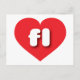 Diese Postkarte zeigt ein lebendiges rotes Herz mit den fett-, weiß-, abgerundeten Kleinbuchstaben fl, eine spielerische Abkürzung für Florida, den sonnigen Staat. Die Rückseite der Postkarte ist leer und wartet auf Ihre handgeschriebenen Stimmungen oder Ihren personalisierten Text.