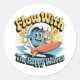 Flow With The Happy Waves Waterproof Sticker adds a splash of joy to your surfaces! This high-quality vinyl sticker features a cartoon wave character surfing happily with a sunny backdrop in retro colors.