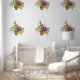 Artistically drawn, flower, honey bee with contrasting colors, yellow, bright, blooming california poppy and blue wild plants on white background.
