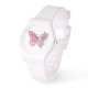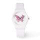 Flower arrangement of pink butterfly with pink Japanese cherry blossoms on white background.