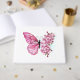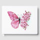Flower arrangement of pink butterfly with pink Japanese cherry blossoms on white background.