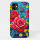 Levendige rode rozen worden omringd door wervelende patronen en kleine gele bloemen, wat een levendige en kleurrijke compositie creëert. De ingewikkelde blauwe en paarse wervelingen op de achtergrond complementeren de bloemen en voegen een dynamische en grillige toets toe.