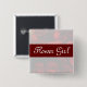 Ein zarter Rosenstrauß über und unter dem Text, der "Blumenmädchen" heißt. Der Text ist in einem knusprigen Weiß auf einem reichen roten Hintergrund. Ein perfektes Button für eine Hochzeitsfeier, um die Mitglieder der Hochzeitsfeier zu identifizieren.