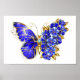 Jewelry, blue, sapphire, sparkling flower butterfly with wing decorated with blue, precious flowers with gold leaves on white background.