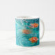 The image shows a serene scene of orange flowers floating on the surface of clear, turquoise water. Concentric ripples emanate from each flower, creating a dynamic pattern on the water's surface. The water reflects light, creating a shimmering effect with varying shades of blue and green. The overall mood is peaceful and tranquil, evoking a sense of calm and natural beauty.