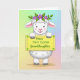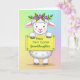 This card shows a fluffy white, lamb-like creature centered against a softly blended pastel background, with round eyes and a faint smile that feels like it’s meant for someone dear 🌷. A light blush on its cheeks and the gentle tilt of its head give it a sweet, affectionate look, like it’s posing for a loved one. Resting on its head is a small crown of purple flowers with green leaves, adding a springtime touch. In its front paws, it holds a rectangular yellow sign with slightly wavy edges, like a cozy little placard. Small green starburst shapes sit near the corners of the sign, adding extra detail without crowding the design. Across the middle of the yellow sign, the message “Happy First Easter Granddaughter” appears in green lettering, centered and easy to read 🐰. Behind it all, the backdrop fades from pale greens and blues near the top into soft pinks and purples toward the bottom.