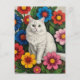 Weiße, flauschige Katze, die in einer farbenfrohen Blume der Volkskunst sitzt. Niedliche Katzenmotive grüßen Postkarte für Katzenliebhaber, um Freundinnen oder Familienmitgliedern Hallo zu sagen.