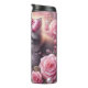 Dieses bezaubernde Bild zeichnet sich durch ein zauberhaftes, flauschiges, graues und weißes Kätzchen mit hellblauen Augen aus. Es ist mit einem großen rosa Bogen und einem rosa Herzcharakter geschmückt. Das Kätzchen ist eingebettet in wunderschöne rosa Rosen und glitzernde Perlen, was eine sehr süße und elegante, feminine Szene schafft.