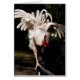 Weißer Hahn, der seine Flügel auf einem Zaun abstürzt. Fotografie.