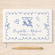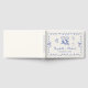 Einzigartiges Retro-inspiriertes HochzeitsGästebuch mit französisch-blauen Flügelrahmen mit Kokettenbögen, skurrile handgezeichnete Illustrationen eines Herzens, Sterne und Weingläser und die Namen von Braut und Bräutigam in einem lustigen, spielerischen Drehbuch.