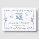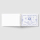 Einzigartiges Retro-inspiriertes Gästebuch mit französisch-blauen Flügelrahmen mit Kokettenbögen, skurrile handgezeichnete Illustrationen eines Herzens, Sterne und Weingläser und die Namen von Braut und Bräutigam in einem spielerisch blauen Drehbuch.