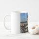 Tasse des Flughafens Zürich, die den Turm der Kontrolle des Flughafens und einen Airbus A320 beim Abflug darstellt