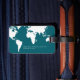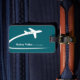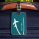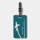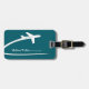 Ein einfaches und modernes Design, um Ihre Sachen zu identifizieren, wenn Sie um die Welt reisen. Weißes Flugzeug auf blauem Hintergrund mit Ihrem Namen auf der Vorderseite und individuelles Zitat "hier geht es wieder"... mit zusätzlichen Informationen auf der Rückseite, mit einer grafischen Weltkarte.