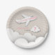 Geburtstags-Party-Teller, der eine Illustration eines Flugzeuges mit einem rosa Streifenfliegen über den Wolken kennzeichnet. Personifizieren Sie den Namen und das Alter.