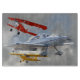 Bunte Flugzeuge in einem bewölkten Himmel.
