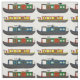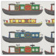 Hausbootbesitzer und Schmalschiffliebhaber werden diesen Stoff mit farbenfrohen, traditionellen Kanalschmalschiffen und weißen Fässeln schmücken. Das perfekte Material für die Inneneinrichtung des Schiffes