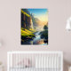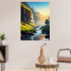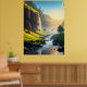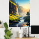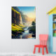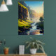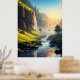 Ein atemberaubender Blick auf ein ruhiges Tal, wo kristallklares Wasser sanft durch üppig grüne Wiesen fließt, mit hohen Felsen und kaskadenförmigen Wasserfällen in goldener Sonne. Diese atemberaubende Landschaft besticht durch die Harmonie von Natur und Ruhe, die sie perfekt für Wandkunst oder Dekoration macht.