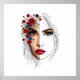 Eine heikle Illustration des weiblichen Gesichts, versteckt unter Wildblumen. Die roten Akzente auf den Lippen und die ausgewählten Blume verleihen der Komposition Kühnheit und subtile Kraft. Ideal für Naturliebhaber, für Liebhaber weiblicher Energie und für Kunst mit einer Botschaft.