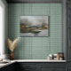 Eine ruhige Landschaft mit einem schattigen, überwältigenden Himmel über einem ruhigen Gewässer umgeben von Gras- und Vegetationsflächen. Die subtile Mischung aus Erdtönen und Blautönen schafft eine beruhigende und reflektierende Atmosphäre.