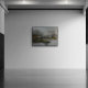 Eine ruhige Landschaft mit einem schattigen, überwältigenden Himmel über einem ruhigen Gewässer umgeben von Gras- und Vegetationsflächen. Die subtile Mischung aus Erdtönen und Blautönen schafft eine beruhigende und reflektierende Atmosphäre.