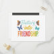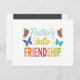 Ein lebendiges Postkartendesign mit dem Text "Flutter into Friendship" in einem farbigen Regenbogen, wobei jeder Buchstabe eine andere Farbe hat. Der spielerische Text ist sicher, das Auge zu erfassen und positive Vibes zu verbreiten.